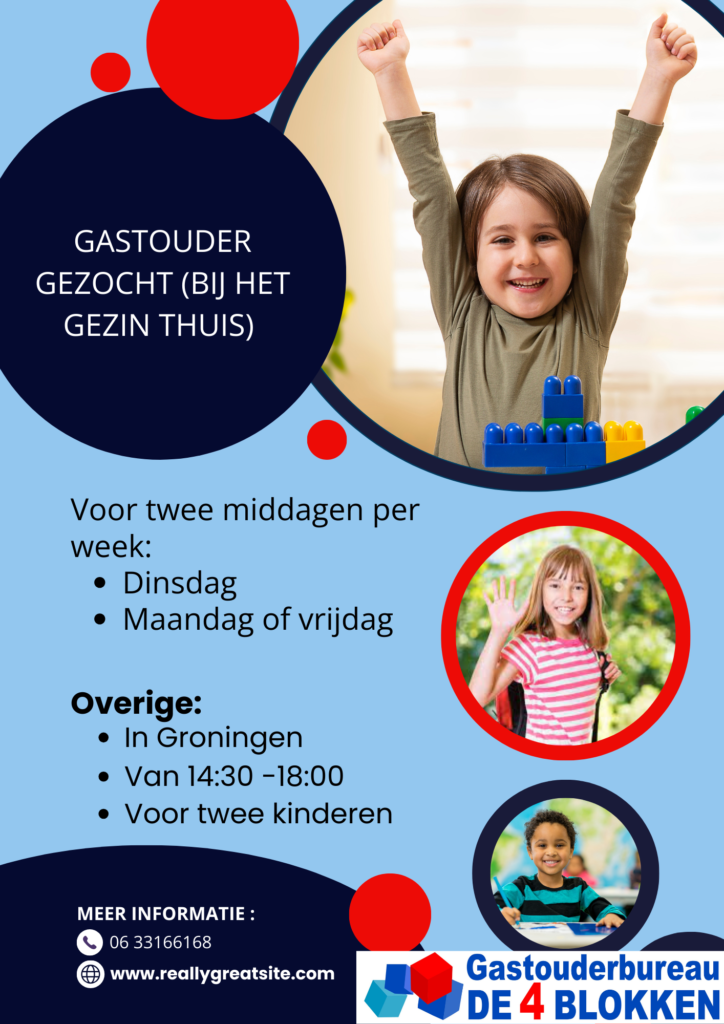 Ik ben op zoek naar een leuke gastouder in Groningen voor twee schoolgaande kinderen.  Het gaat om opvang bij het gezin thuis.