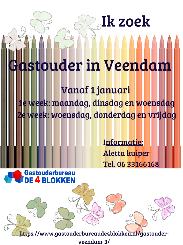 Ik ben op zoek naar een gastouder in Veendam. De gastouder vangt bij haar/hem thuis kinderen op