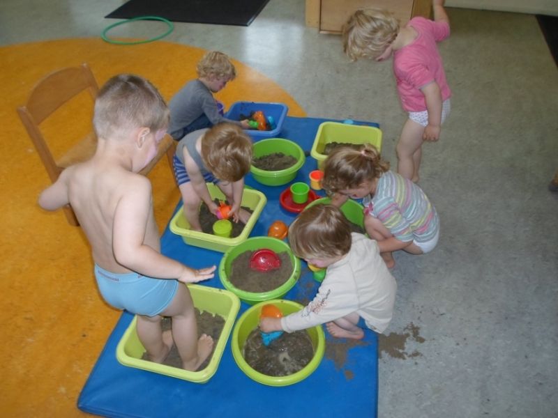 * Bloten voetenpad. Zet op de grond 4 verschillende teiltjes met water, zand, aarde en in de 4e van alles wat. Ga kinderen evt. blinddoeken en laat ze de verschillen voelen.